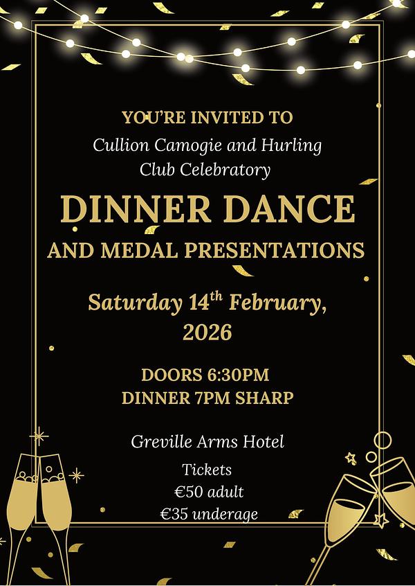 Doors open at 6.30 with dinner and music to follow. Join us for an evening of celebrations as we honor five of our teams between the camogie and hurling club that were successful in 2025! To purchase your ticket pease contact Emma on 087 2947896